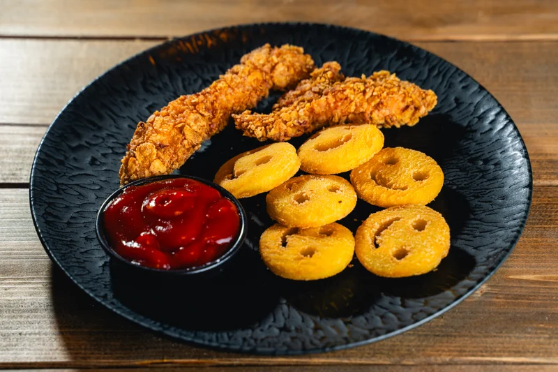 Egy mókás falatcsoda a legkisebb vikingeknek! Ropogós tortillabundába bújt csirkecsíkok (mint a nagyoknak, csak pont neked), mellé pedig egy adag mosolygós krumpli, ami biztosan mosolyt csal az arcodra is. Finom, játékos és pont annyira vagány, mint te!